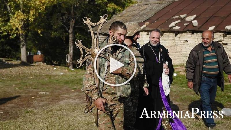 Հրետակոծության տակ զինվորականն ու հոգեւորականը Արցախում տեղադրում են եկեղեցու խաչը