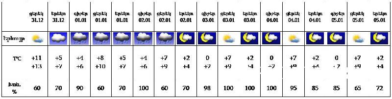 Դեկտեմբերի 31-ի ցերեկը, հունվարի 3-5-ին սպասվում է առանց տեղումների եղանակ: Հունվարի 1-2-ին ժամանակ առ ժամանակ սպասվում են տեղումներ:
